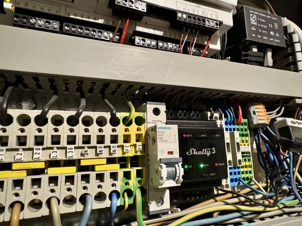 Möchte man nun das Ganze um die Smart-Grid Steuerung erweitern, nimmt man am besten dazu einen Shelly Pro3 und baut diesen direkt in die Hutschiene der Wärmepumpen Elektronik.